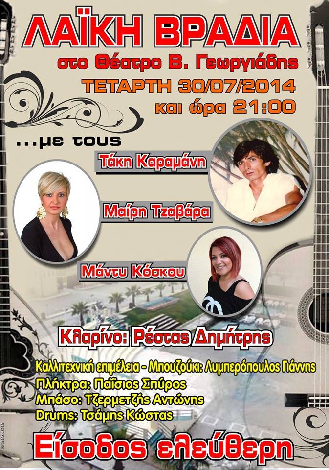 Λαϊκή βραδιά στο θέατρο Βασίλης Γεωργιάδης 30/07/2014 21:00