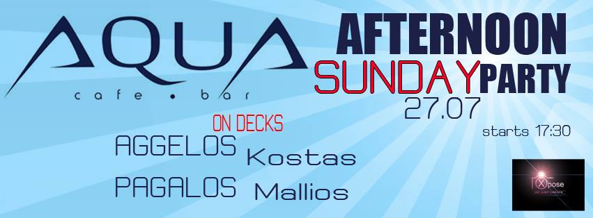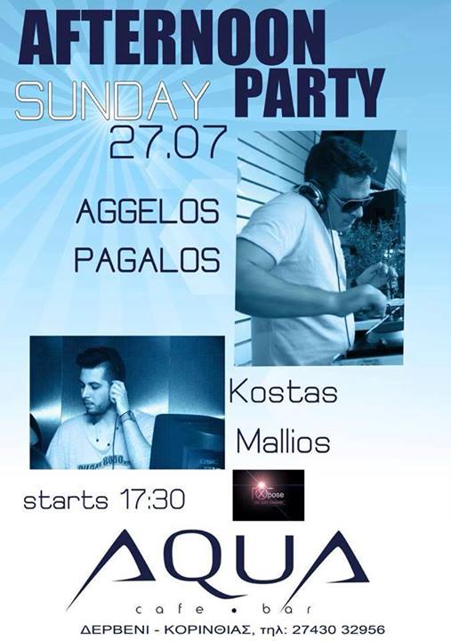 Events στο Ξυλόκαστρο AQUA SUNDAY 27 JULY AFTERNOON PARTY AGGELOS PAGALOS & KOSTAS MALLIOS Posted by admin 25 Ιουλίου 2014 On 25 Ιουλίου 2014 AQUA SUNDAY 27 JULY AFTERNOON PARTY AGGELOS PAGALOS & KOSTAS MALLIOS