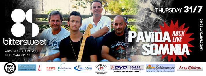 Events στο Ξυλόκαστρο PAVIDA SOMNIA LIVE 31/7 @ BITTERSWEET CLUB Posted by admin 29 Ιουλίου 2014 On 29 Ιουλίου 2014 PAVIDA SOMNIA LIVE 31/7 @ BITTERSWEET CLUB
